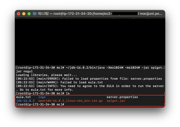 spigot.jar은 실행할 서버 파일 이름입니다. ls 명령어를 사용해 파일명 확인 후 입력해주세요. 다운로드할 때마다 달라지더라고요.